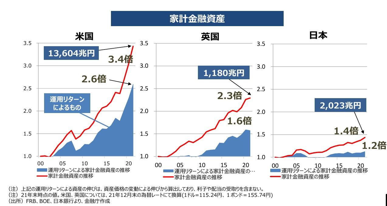 ■米国では金融資産は3.4倍、■英国では金融資産は2.3倍、■日本は1.4倍となっています。この増加の要因は運用による増加が